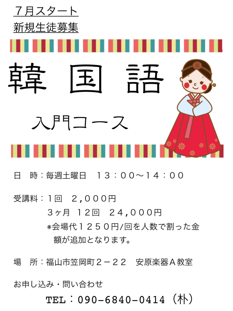 ※韓国語講座のお問い合わせ・お申し込みは090-6840-0414へお願いします。