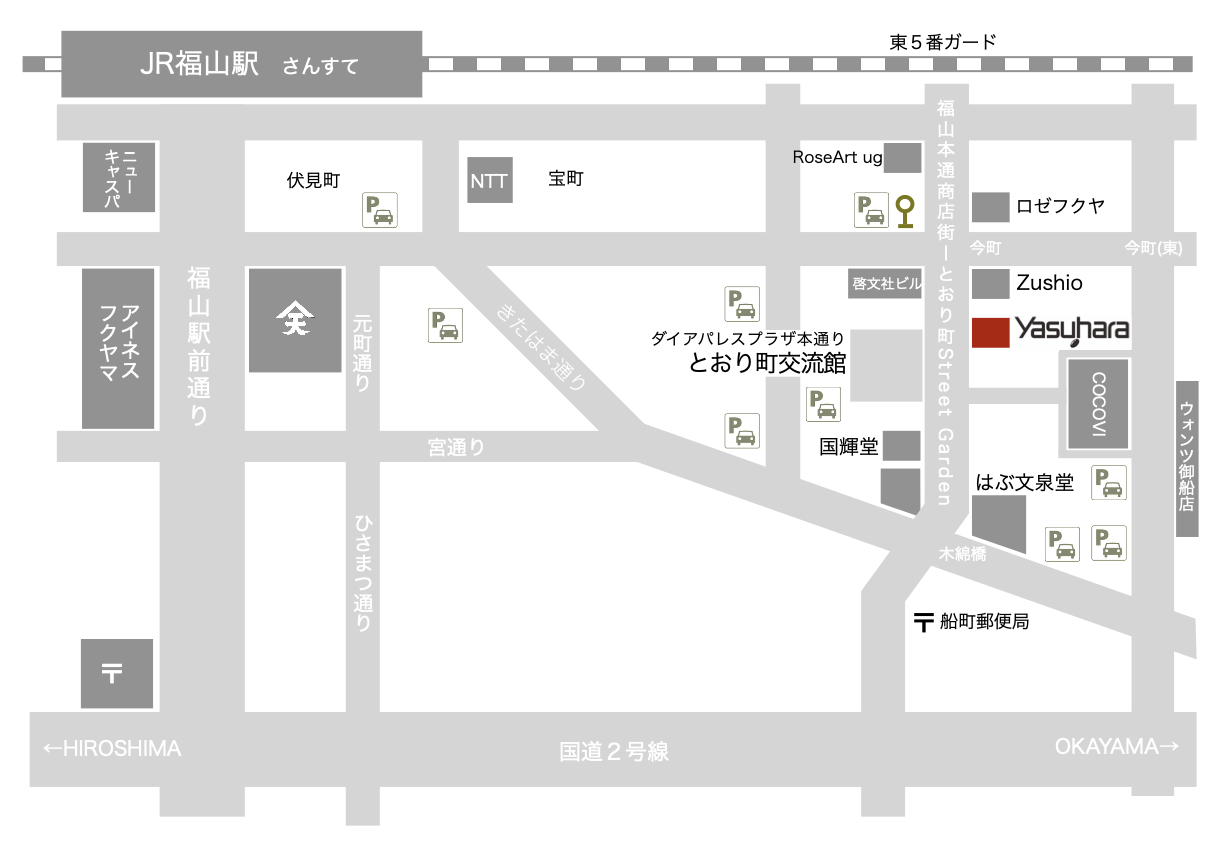 とおり町StreetGarden(福山本通商店街)の中心に位置する「とおり町交流館」の向かい側の「yasuhara」の看板が目印です。